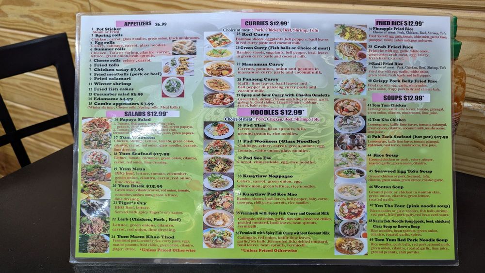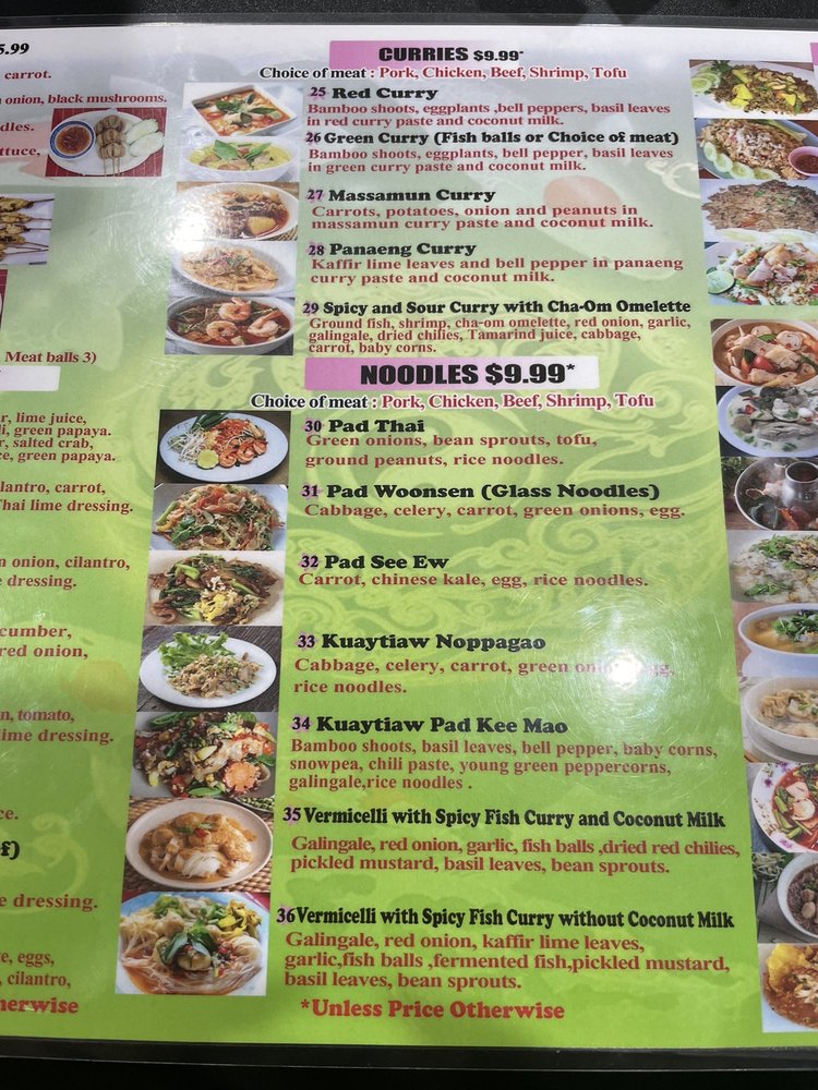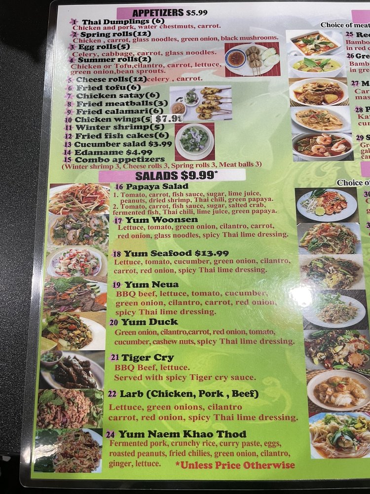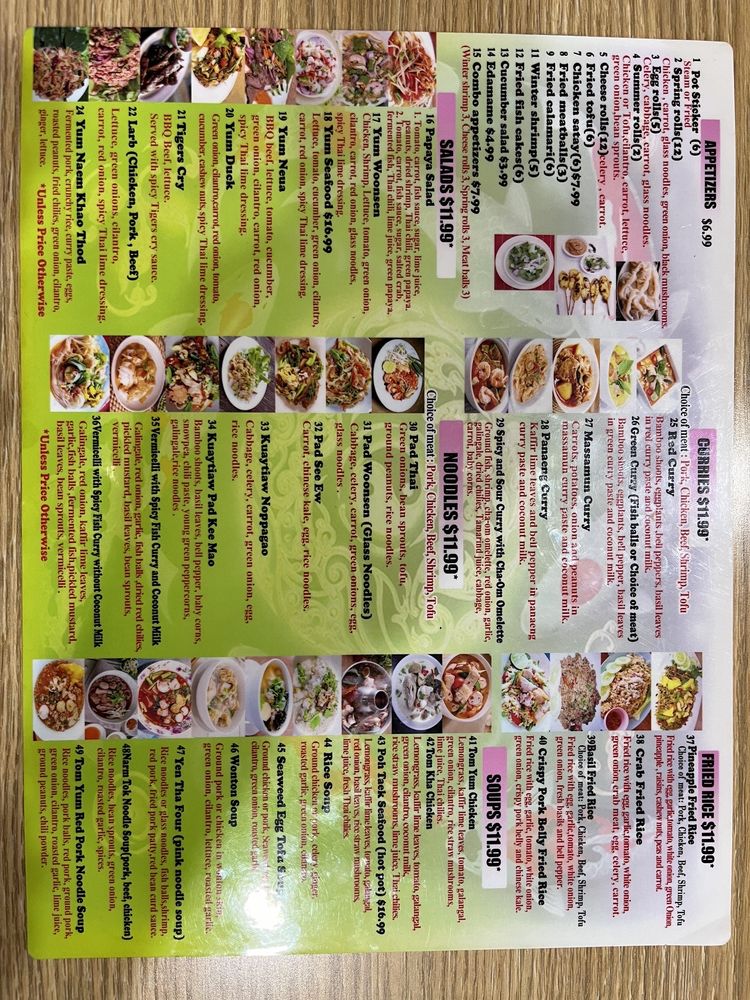 The menu is a delightful exploration of traditional Thai dishes, featuring a variety of rich curries, savory noodle options, and even a selection of unique street food. Highlights include the Red Curry with bamboo shoots and bell peppers, the aromatic Pad Kee Mao, and the adventurous Three Best Friends dish, showcasing BBQ pork, fried pork belly, and Chinese sausage. Each dish is carefully crafted, ensuring genuine flavors that transport you straight to Thailand.